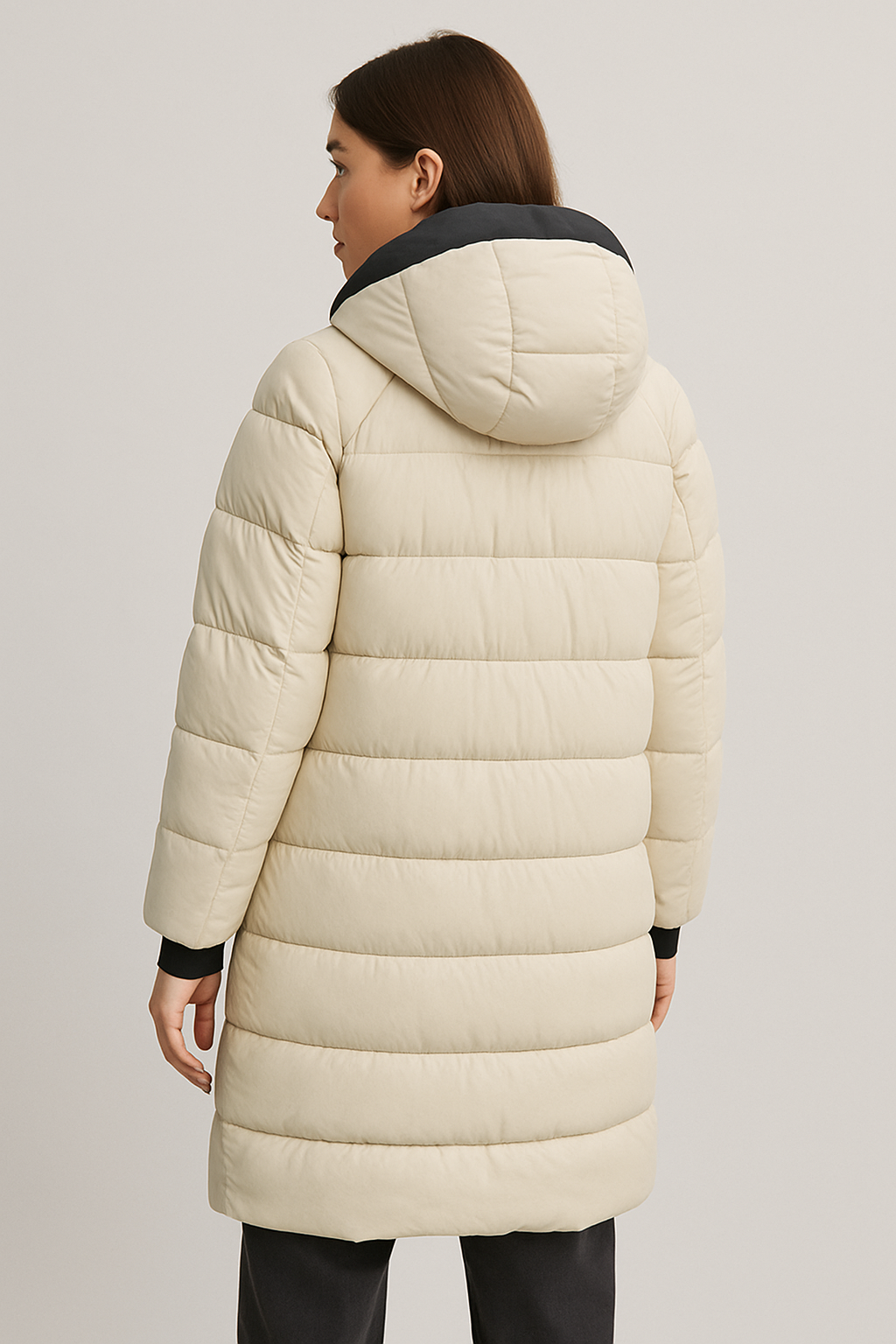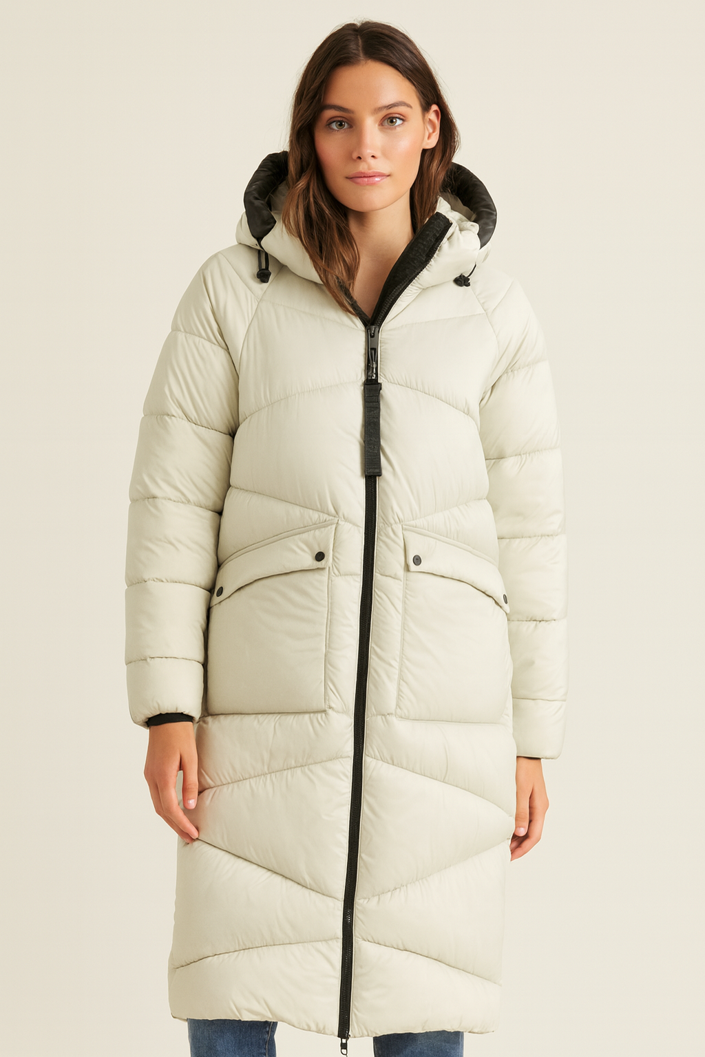 Der Mantel überzeugt durch seine lange, gerade Silhouette, eine schützende Kapuze mit Kordelzug sowie funktionale Pattentaschen. Ein durchgehender Frontreißverschluss mit schwarzen Akzenten und feine Steppnähte runden das Design stilvoll ab. Die hochwertige Füllung sorgt für angenehme Wärme, ohne zu beschweren.